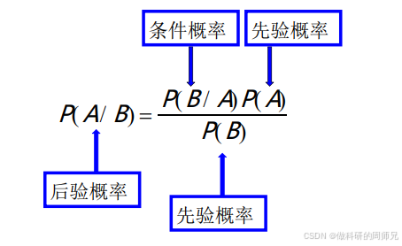 - P(A|B):后验概率(Posterior Probability)—— 这是我们最终要算的 “目标”:在 “事件 B 发生” 的前提下,“事件 A 发生” 的概率。比如 “女神冲我笑(B)” 的前提下,“女神喜欢我(A)” 的概率。
