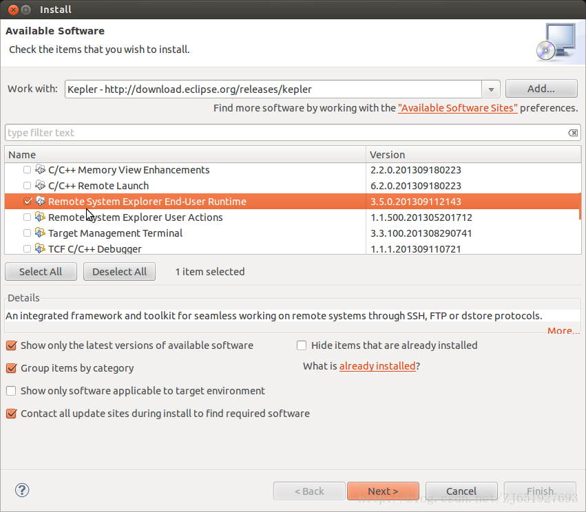 - 为了能够更方便地通过PC来查看、操作Beaglebone,以及更加方便地调试,需要安装另外一个插件, RSE-runtime。 打开Eclipse之后,依次选择Help -> Install new software, 在弹出来的对话框里的第一个输入框里输入Kepler - http://download.eclipse.org/releases/kepler,之后Eclipse会联网下载可更新软件目录,下载目录完成后,对话框的中间会有很多插件可供安装,点击 Mobile and Device Development 前面的小三角,在展开的目录项中勾选 Remote System Explorer End-User Runtime,然后按照提示即可安装完成。如下图所示: