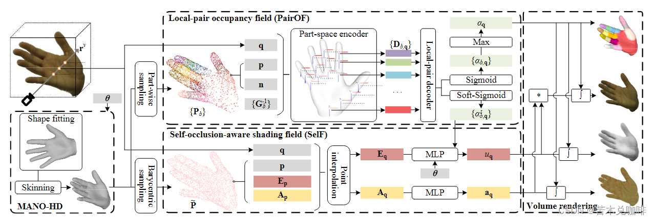 MANO-HD模型:作为高分辨率网络拓扑来拟合个性化手部形状将手部几何结构分解为每个骨骼的刚性部分,再重新组合成对的几何编码,得到一个跨部分的一致占用场纹理建模:在MANO-HD表面设计了可驱动的anchor,记录反照率;定向软占用用于描述光线-表面关系,生成照明场,进一步用于解耦与姿态无关的反照率和与姿态相关的照明。