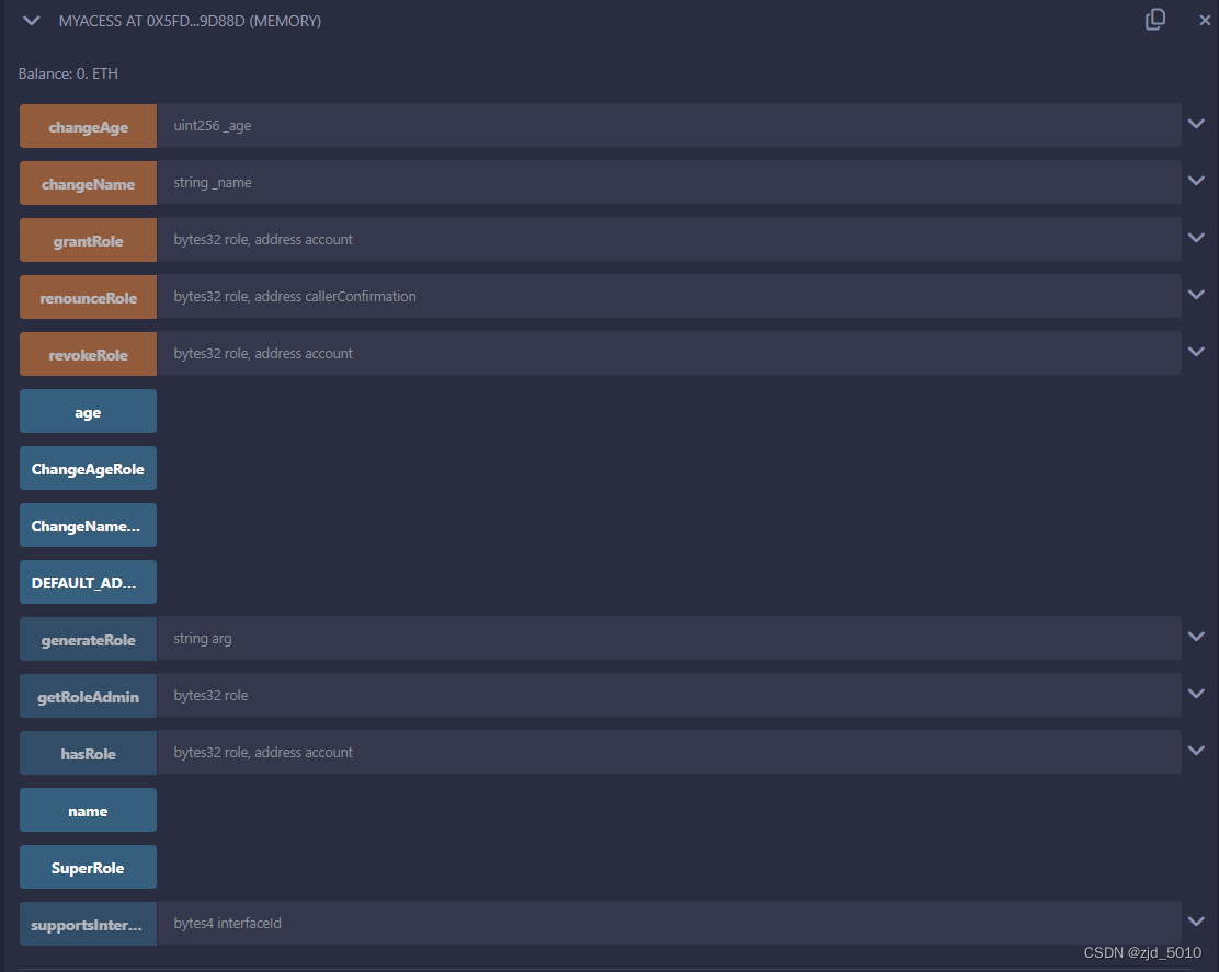 假设部署合约的地址为address_deploy,初始阶段,address_deploy无法调用changeName和changeAge,执行下grantRole(ChangeNameRole,address_deploy),再次调用,发现changeName调用成功,changeAge调用失败。