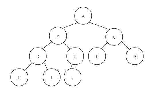 同时我们也可以发现树节点的总数为n=n0+n1+n2。通过下图的例子,节点总数为10,它是由A、B、C、D度为2的节点,F、G、H、I、J度为0的叶子节点和E这个度为1的节点组成的。总和为4+1+5=10。
