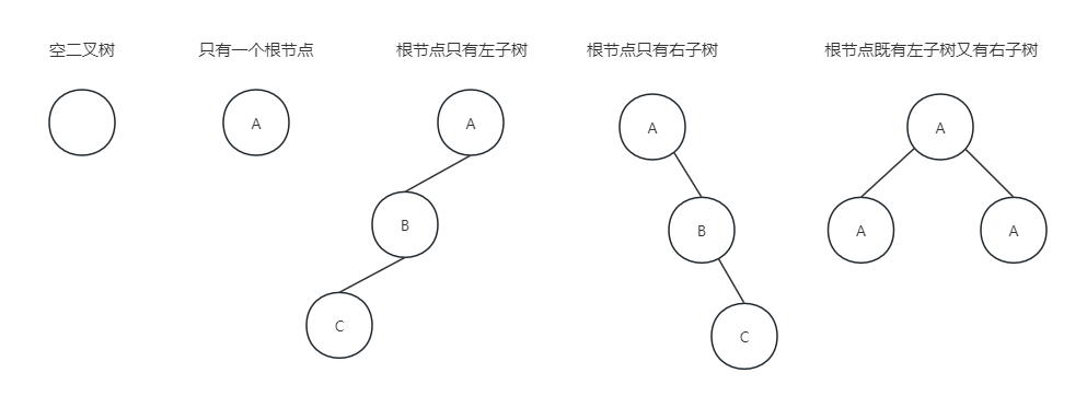 二叉树具有以下五种基本形态:空二叉树、只有一个根节点、根节点只有左子树、根节点只有右子树、根节点既有左子树又有右子树。