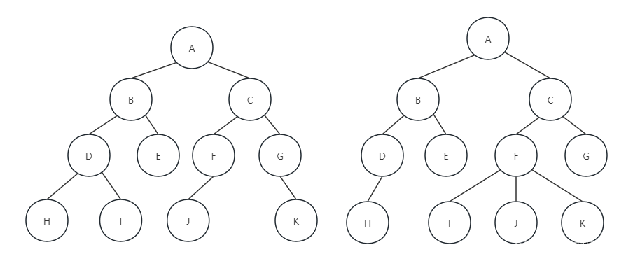 二叉树是n(n>=0)个节点的有限集合,该集合或者为空集合(称为空二叉树),或者由一个根节点和两棵互不相交的、分别称为根节点的左子树和右子树的二叉树组成。在下面的图中,左边的就是一棵二叉树,而右边的因为它的F节点有3个子节点,所以它不是二叉树。