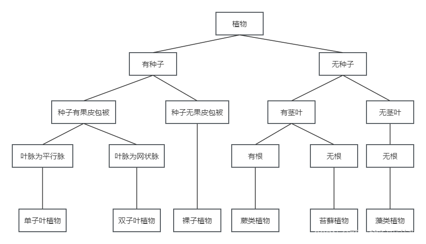 生活中,我们经常会遇到管理大量数据的情况,比如图书馆书记的分类。而二叉树这种数据结构正是用来解决这种问题的,当我们阅读书时,书中的每个条目都有专门分类和子分类,为了更好的组织这些内容,需要使用一种高效的数据结构来存储和访问信息。下面举个简单的例子来引入二叉树,我们在中学学习生物时知道了植物主要分为:种子植物、苔藓植物等。那它们是如何进行分类的呢?我们看下面这张图片: