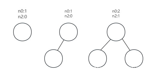 首先,我们先看只有一个根节点的时候,度为0的节点个数n0=1,度为2的节点的个数为n2=0。我们设度为1的节点的个数为n1,接着,我们给根节点加一个节点,这时候一定会减少一个度为0的节点(一个度为0的节点变为度为1的节点),然后再加一个度为0的节点(新增的节点因为没有子节点,所以增加一个度为0的节点),度为0的节点个数变化之后和之前的个数一样,所以n0仍为1,n2仍为0。然后,我们再加一个节点,这时候会减少一个度为1的节点,然后增加一个度为0的节点和一个度为2的节点 (度为1的节点变来)。通过这个规律我们可以发现度为0的节点比度为2的节点多1个,即n0=n2+1。