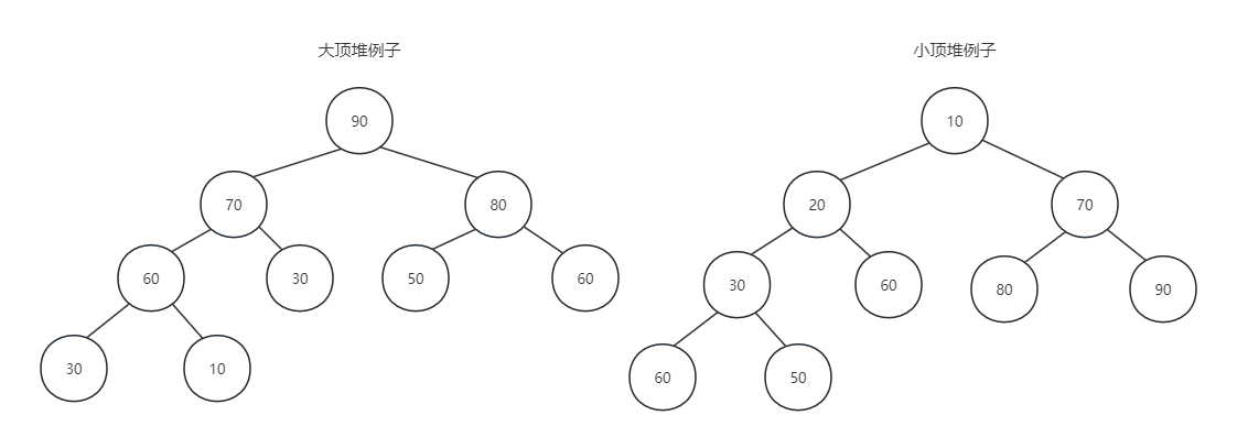 堆是具有下列性质的完全二叉树:每个结点的值都大于或等于其左右孩子节点的值,称为大顶堆;或者每个结点的值都小于等于其左右孩子结点的值,称为小顶堆。如下图所示: