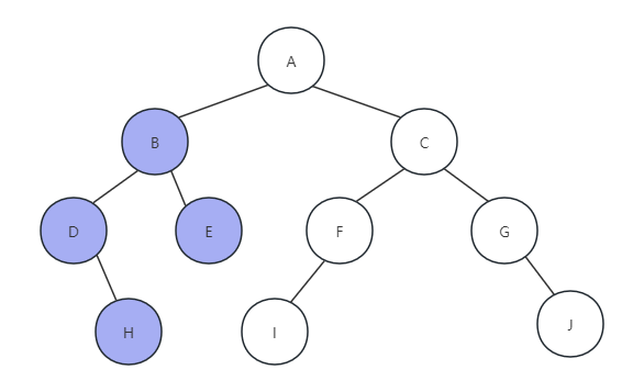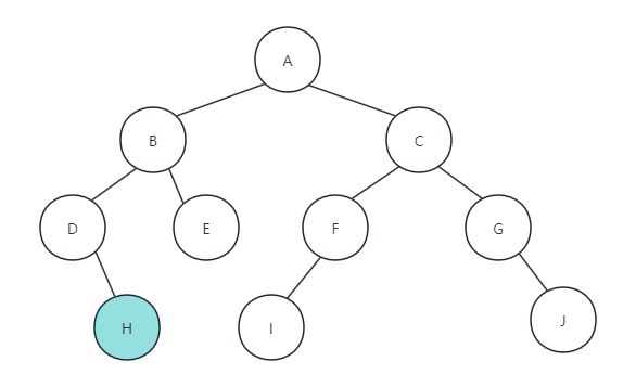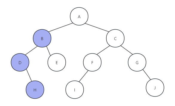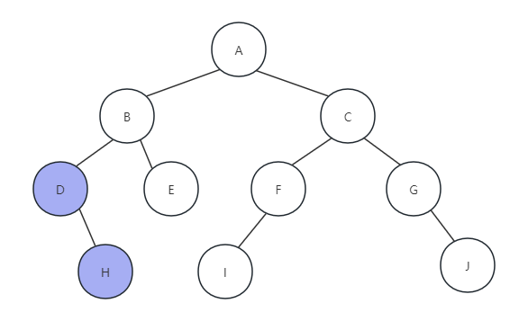 (3) 因为H节点没有右孩子,所以返回,打印节点D函数执行完毕,返回打印字母B,如下图所示: