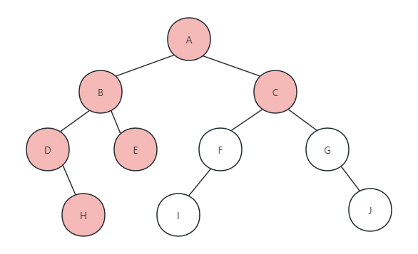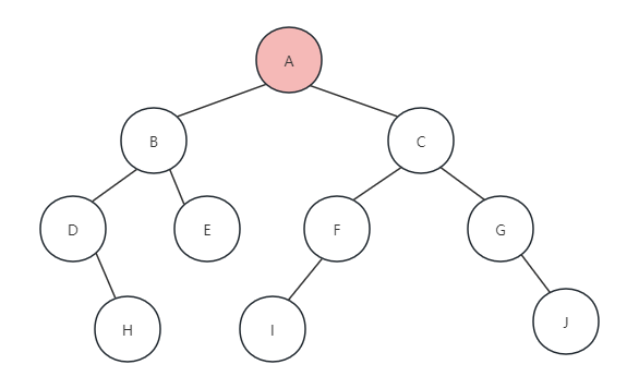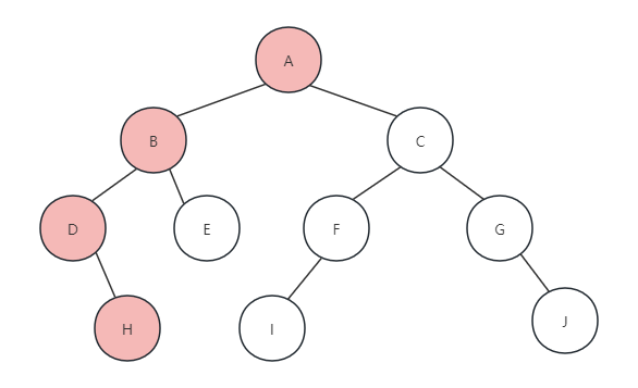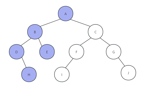 最终,后序遍历地节点的顺序为H、D、E、B、I、F、J、G、C、A,可以完全参考前面的两个遍历方法来得到这个结果。