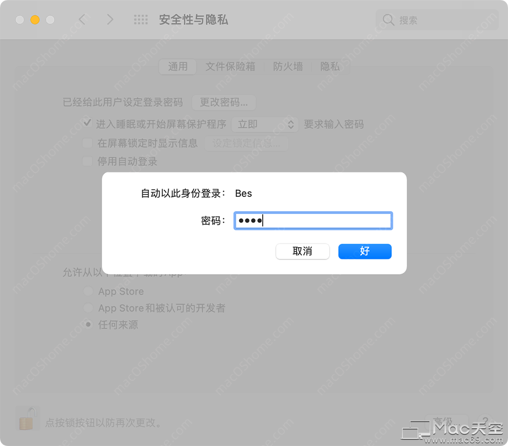 3.弹出密码输入界面,输入你的mac开机密码,然后重启就是直接进入桌面了,不会再需要你输入密码了。