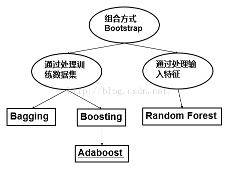 提到组合方法(classifier combination),有很多的名字涌现,如bootstraping, boosting, adaboost, bagging, random forest 等等。那么它们之间的关系如何?用下图来理清思路:
