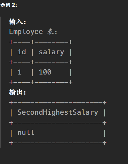// 题目中涉及了两个关键词 "第二" 和 "null", 所以我们需要注意的就是这两个点, 另外还需要确保这个 "第二" 和 "第一" 不能重复, 所以在查 "第一" 的时候还需要用到一个关键词 "distinct" (去重复)