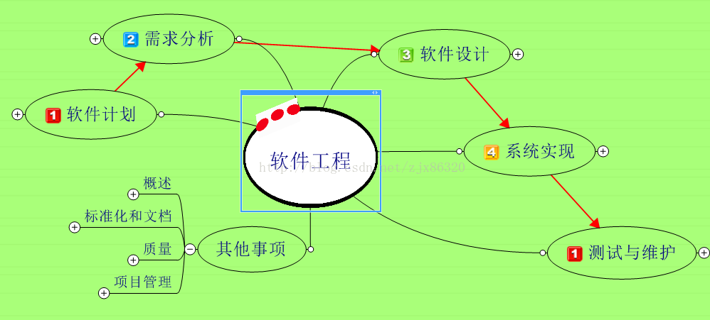 软件工程是一门研究如何用系统化、规范化、数量化等工程原则和方法去进行软件开发和维护的学科。具体研究对象是软件系统,主要包括软件开发技术和软件项目管理两方面内容。很明显,在这个思维导图中,我爸软件开发技术放在一个比较重要的位置。而将软件项目管理等相关内容放在一个模块来讨论。