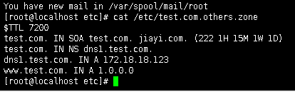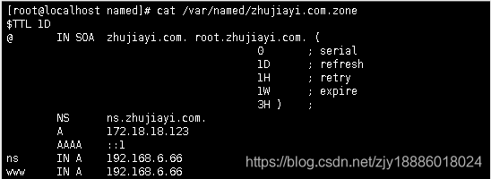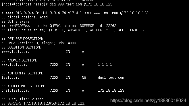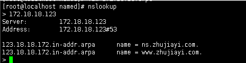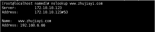 检验解析结果前,需要将DNS地址参数修改成本机IP地址,这样就能由本机提供DNS查询服务了,nslookup命令用于检测能否从DNS服务器中查询到域名与IP地址的解析记录,检测DNS服务器是否能够为用户提供服务。并重启服务:# service named restart