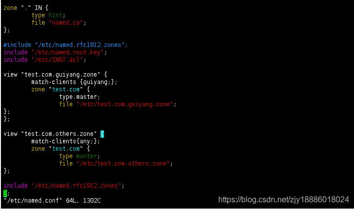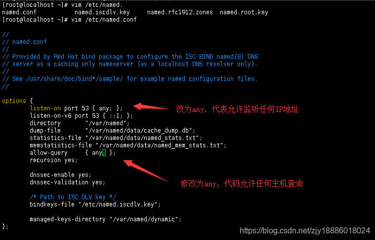 1、编辑主配置文件(named.conf):vim /etc/named.conf