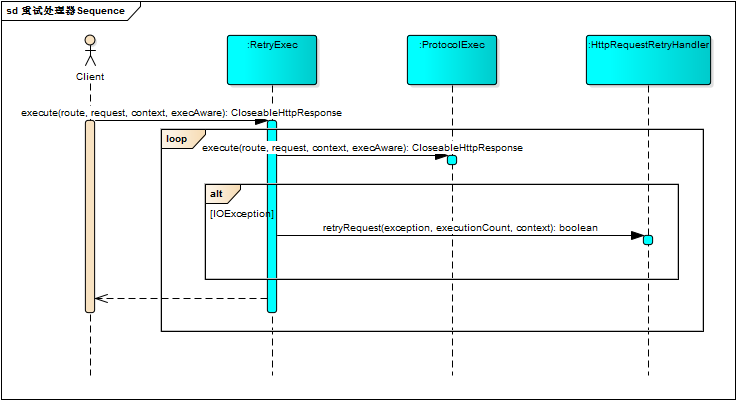 请求执行链上的RetryExec询问HttpRequestRetryHandler是否进行重试。是否进行重试主要考虑两点:发生的异常类型是支持重试,发送的请求类型是否支持重试。