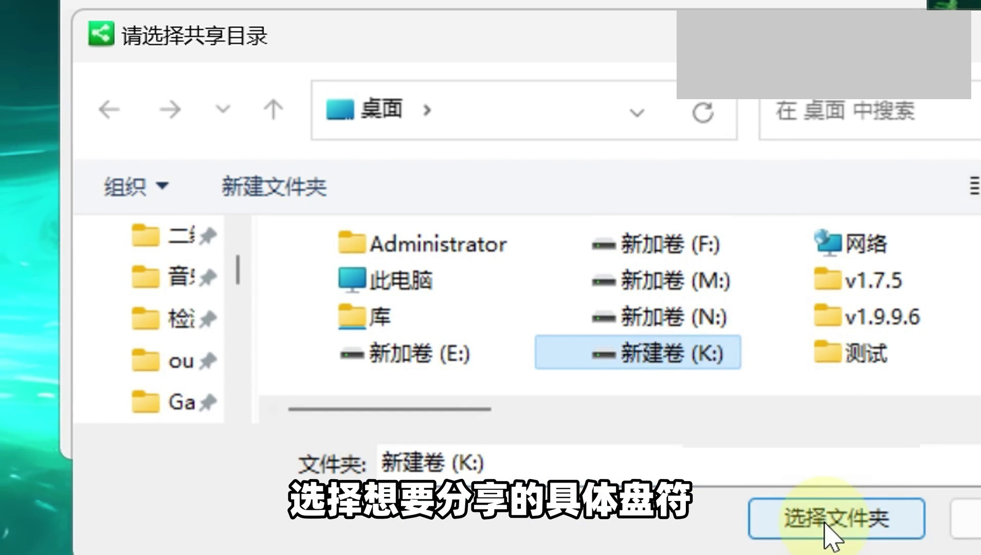 在弹出的窗口选择要共享的盘符或文件夹