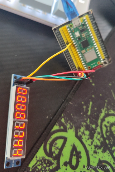 Micropython RP2040 使用 八位数码管模块 MAX7219控制八位数码管 八位数码管模块通过微控制器或单片机等控制器进行控制,通过向数码管发送相应的信号,以驱动数码管显示所需的数字或字符。八位数码管模块是一种用于显示数字的模块,由多个LED段组成,可以显示0-9的数字和一些特定的字符。该驱动中的字符只涉及到数字和部分字母,有其他需要可以自行添加,该驱动也只实现了简单的使用,有其他需要可以参照数据手册更改驱动。这里暂时只使用一个数码管,不涉及连接多个数码管,如需连接多个数码管,只需要将数码管另一侧针脚依次按照顺序接在下一个数码管上。Thonny+RP2040+八位数码管+杜邦线。