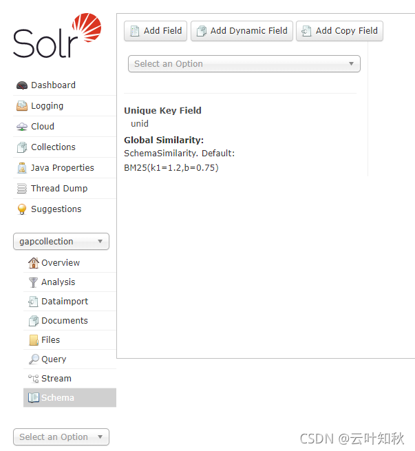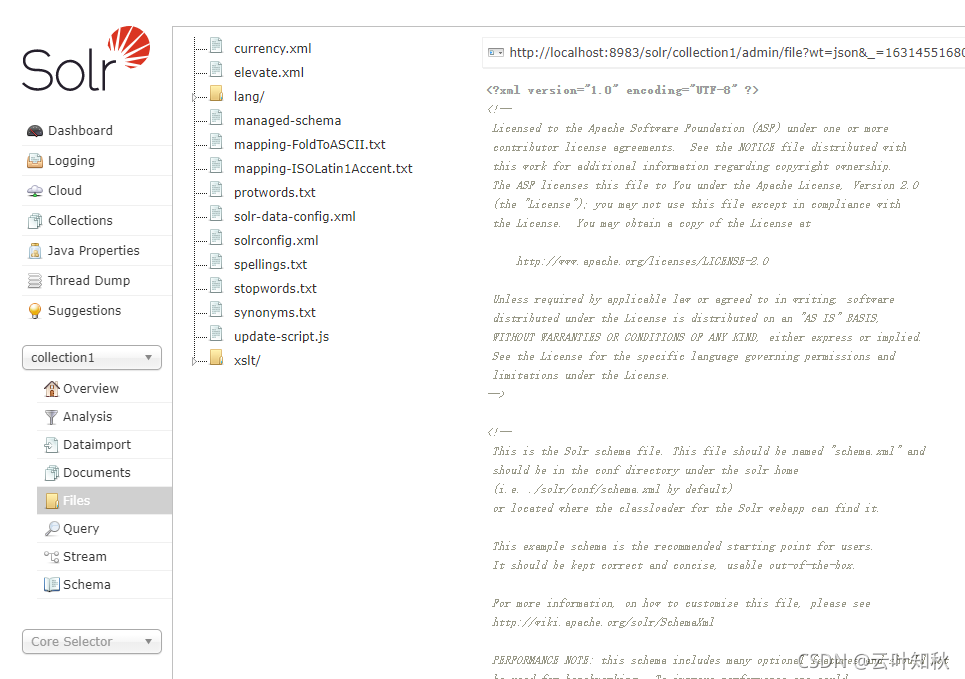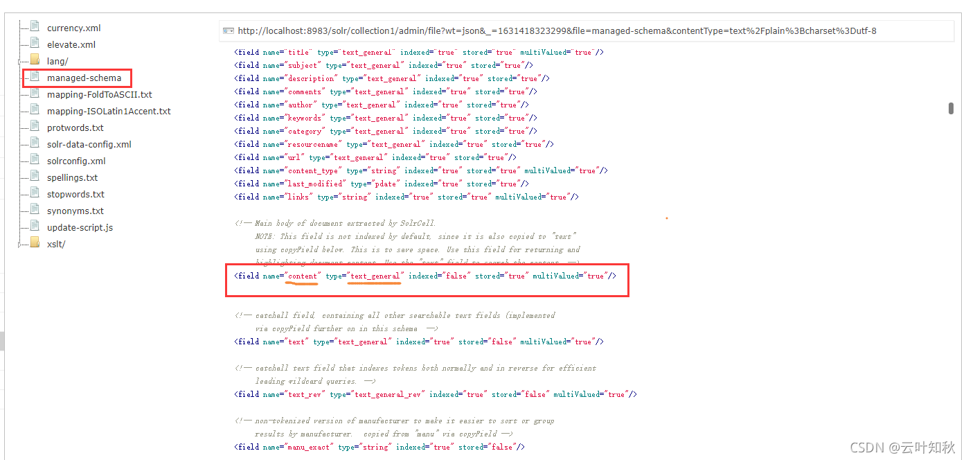 我们可以通过managed-schema的配置文件来查看下content字段的配置吧,来增进我们的理解,我们从solr管理控制台的Files菜单也可以查看managed-schema文件的内容