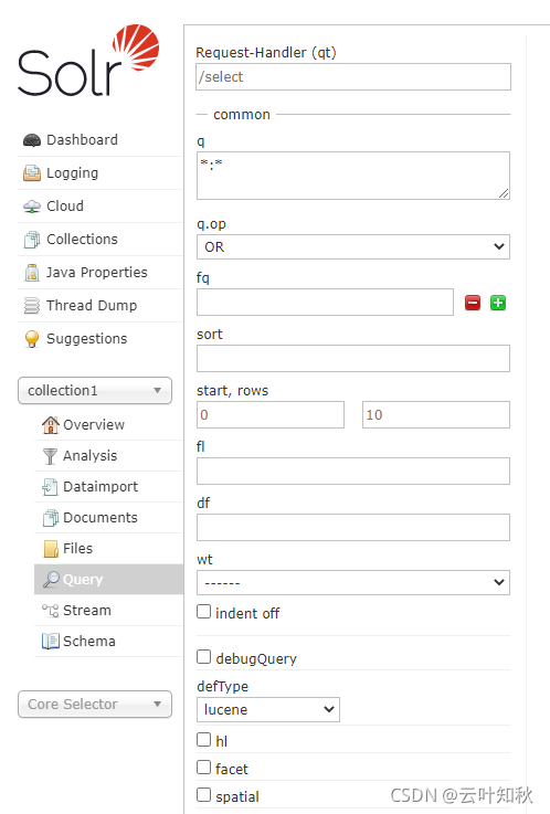 查询解析器:Solr管理控制台提供的查询索引数据的工具,这里暂时先介绍常用的几个参数,后续有机会再补充其他的参数说明