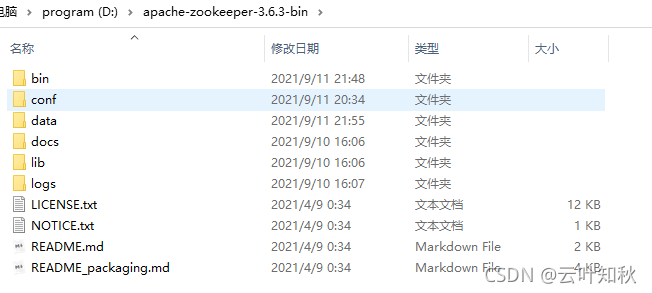 下载完Zookeeper的压缩包后,解压压缩包,目录结构如下: