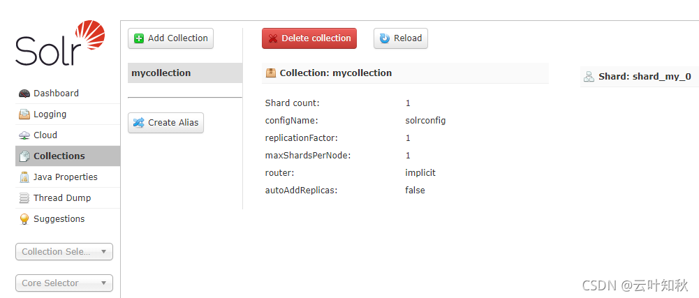 在弹窗的config set中就可以下拉选择到上传到zookeeper的配置文件,我们上述步骤上传的配置文件名称为solrconfig,在shards中可以指定shard的名称,不过router必须要选择Implicit才可自行定义shard名称,一切都选择好后点击Add Collection按钮完成Collection的创建,创建结果如下图: