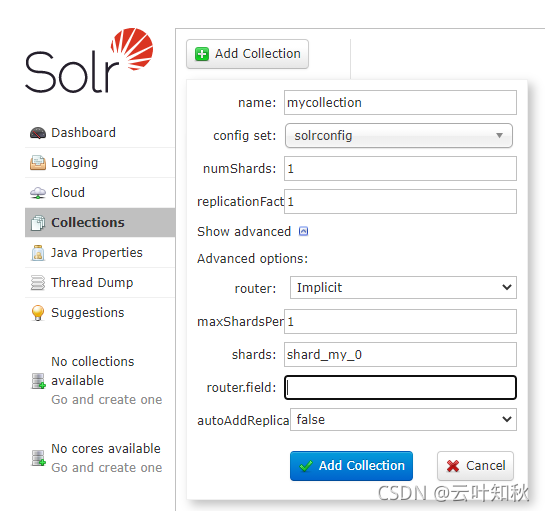 Solr以Cloud模式启动后,要创建collection后才能进行数据的索引,创建步骤如下图: