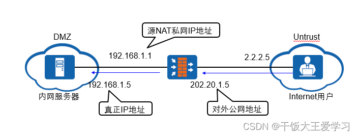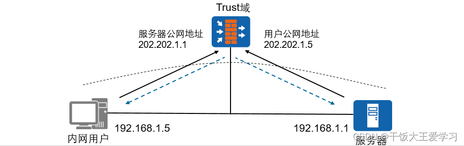 首先先来阐述一下什么是域内双向NAT技术,域内NAT是指当内网用户和服务器部署在同一安全区域的情况下,仍然希望内网用户只能通过访问服务器的公网地址的场景。在实现域内NAT过程中,既要将访问内部服务器的报文的目的地址由公网地址转换为私网地址,又需要将源地址由私网地址转换为公网地址。若需要地址转换的双方都在同一个安全域内,那么就涉及到了域内NAT的情况。当FTP服务器和用户均在Trust区域,用户访问FTP服务器的对外的公网IP地址,这样用户与FTP服务器之间所有的交互报文都要经过防火墙。这时需要同时配置内部服务器和域内NAT