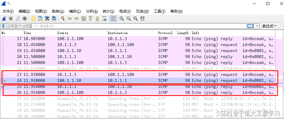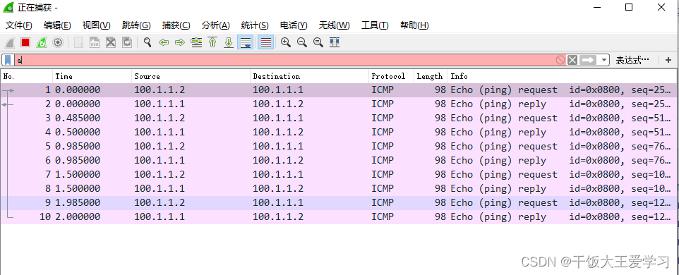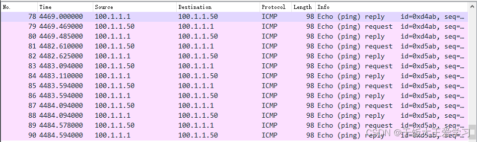 7. 抓包查看,发现有两个请求和两个回应的包,也就是两对ICMP的包,一去一回,数据包的走向是这样子的,客户端10.1.1.3源地址转换成100.1.1.10来访问服务器映射出来的100.1.1.100的公网地址