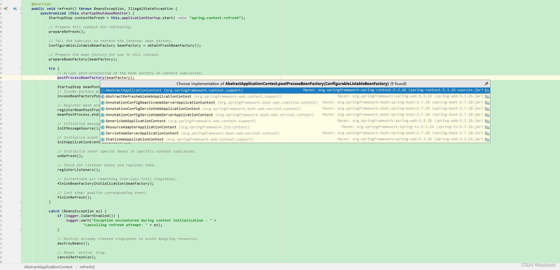 在spring中鼎鼎有名的就是AbstractApplicationContext的refresh()了。用于进行spring的一系列启动相关的操作,具体查看源码。
