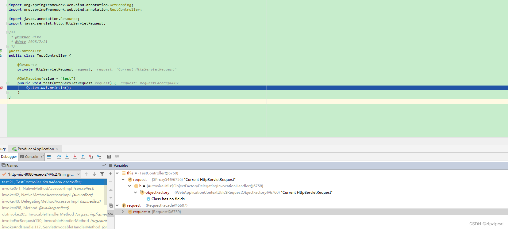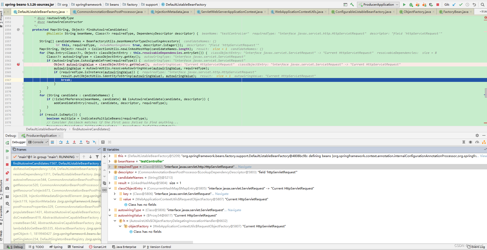 HttpServletRequest 每次获取不同的对象是由于 sprnig ioc 容器启动时把 HttpServletRequest 的父接口 ServletRequest 封装到 ObjectFactory 每次请求时调用AutowireUtils.resolveAutowiringValue() 生成类型为 ObjectFactory 的动态代理对象,确保每次请求的 HttpServletRequest 和 HttpServletResponse 不是同一个。