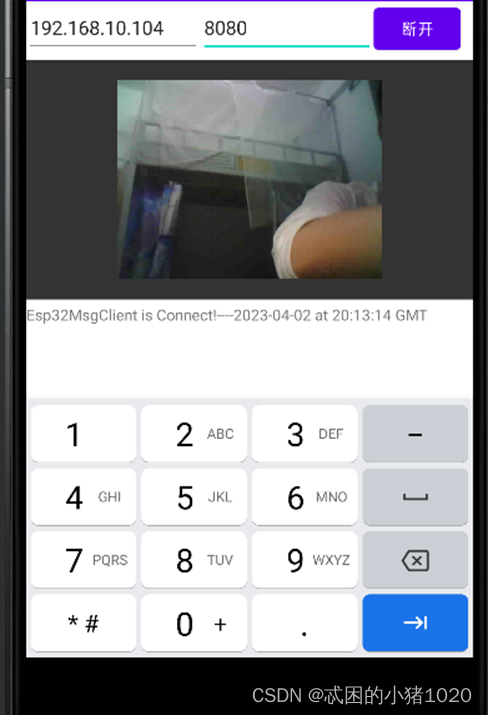 编写Android studio代码,将每一帧视频的图片导入监控页面上,输入在arduino中成功连接的IP地址和端口号。连接以后结果如下,即可将摄像头采集到的视频导入到你想做的app上了。