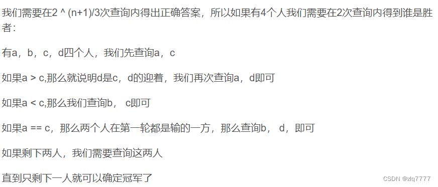 分析:首先有个很直接简单的思路就是从1开始询问,不断的找出赢场最大的那个人,复杂度是,但是这个不满足,考虑分治优化(个人思路,可以类比冒泡排序和归并排序的思路,线性可以分治优化,这个还是很妙的),发现如果当只剩两个的时候,直接一次询问即可,剩四次的时候,发现只要两次即可;