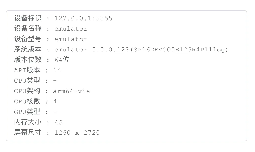 设备信息,能够查看到当前设备的一些常见信息,如系统版本,屏幕尺寸,内存大小,CPU架构等等。
