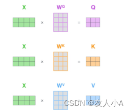 - 对输入编码器的每个词向量,都创建3个向量qkv, 词向量Input(如“Thinking")