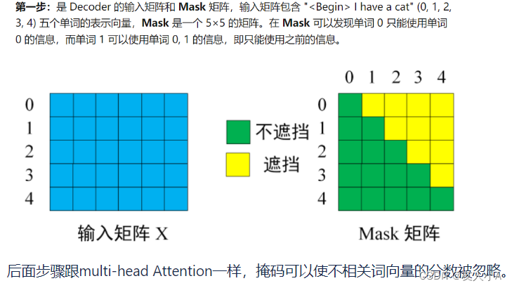 后面步骤跟multi-head Attention一样,掩码可以使不相关词向量的分数被忽略。