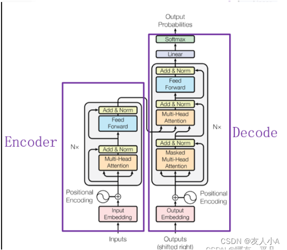 - Decoder 则负责生成目标语言的输出序列(例如目标语言句子),它需要根据输入序列的隐藏表示以及前面预测的部分来生成下一个输出。
