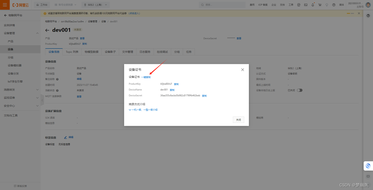 阿里云新版公共实例从注册账号到创建设备生成参数教程 参考下面链接阿里云文档,生成mqtt参数(设备clientid任意)认证成功后,点击上一步界面开通,就可以开通物联网那个平台功能。点击上图空白地方,进入公共实例,点击设备管理产品,创建产品。注册成功后,登录返回第一次打开的界面,点击控制台。点击左上角的菜单,弹出新窗口,搜索物联网平台。如图填写,点击确认,具体含义可以搜索阿里云。打开阿里云官网,点击右上角的登录/注册。打开的界面按照图片输入手机号注册。点击管理设备,添加设备。点击控制台后界面如下。