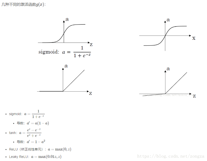 - ReLU弥补了前两者的缺陷,当z>0时,梯度始终为1,从而提高神经网络基于梯度算法的运算速度。然而当z<0时,梯度一直为0,但是实际的运用中,该缺陷的影响不是很大。