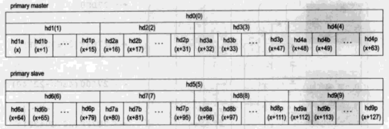 在这里我们还是只看主IDE通道上连接两块硬盘的情况。图中括号内的便是次设备号。主盘是hd0,其次设备号为0,它的主引导扇区分区表对应四个分区分别是hd1、hd2、hd3、hd4。每个扩展分区中最多有16个逻辑分区,以字母a~p表示,逻辑分区的次设备号是以hd1a为基准递增的。这种编号规则的好处是,给定一个次设备号,可以很容易地计算出它是主分区还是扩展分区,或者是哪个扩展分区的哪个逻辑分区。同时,给定一个分区的名称,我们也很容易计算出其次设备号。