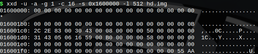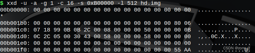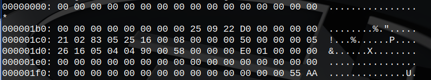 现在我们就来实际看一下分区表是什么样子的,用二进制查看器来看一下引导扇区: