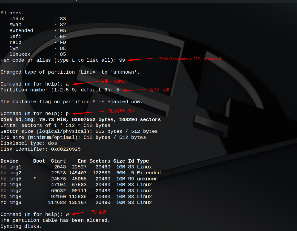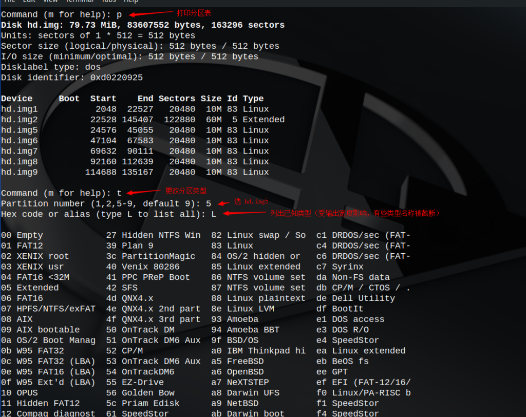 在这里我们把一个80MB的硬盘映像分成了一个主分区和一个扩展分区,扩展分区中又分成了五个逻辑分区(逻辑分区过程截图并未完全显示,也可以根据自己想法进行分区)。我们将来把Orange’s装在第一个逻辑分区上,也就是hd.img5的分区。我们先是把它的分区类型(System ID)改成99h,又为它设定了“可启动”标志。在设置分区类型时,我们先是列出了已知的类型,然后选定还未使用的99h作为我们文件系统的System ID。