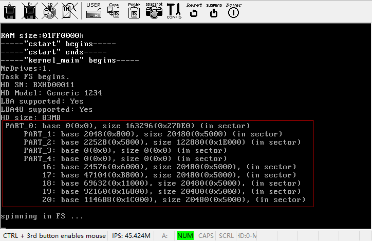 好了,现在FS会把hd2a的次设备号发给dd_map[DEV_HD].driver_nr,即TASK_HD——我们的硬盘驱动,然后驱动程序将执行hd_open,从而获取硬盘的分区信息。现在我们可以make并执行看一下效果了。提醒一下,由于我们新增加了头文件,所以不要忘记更改Makefile。运行效果如下图所示。