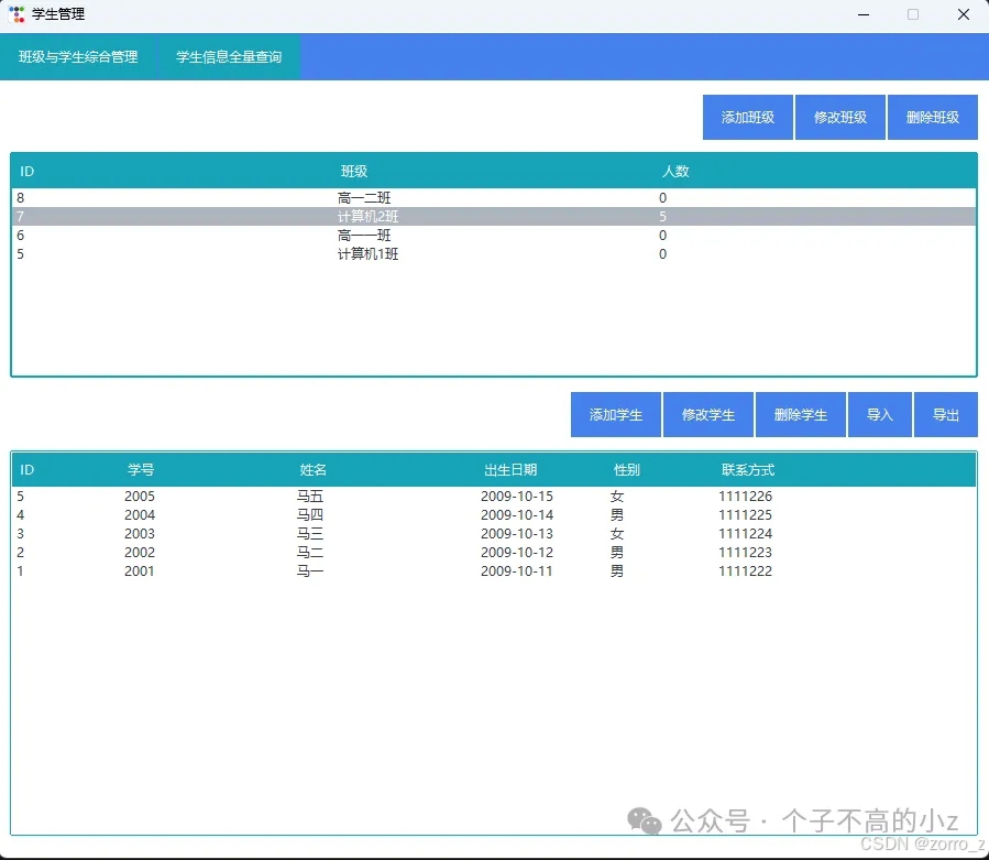 采用上下分区式GUI布局,精准实现班级-学生的层级化管理: