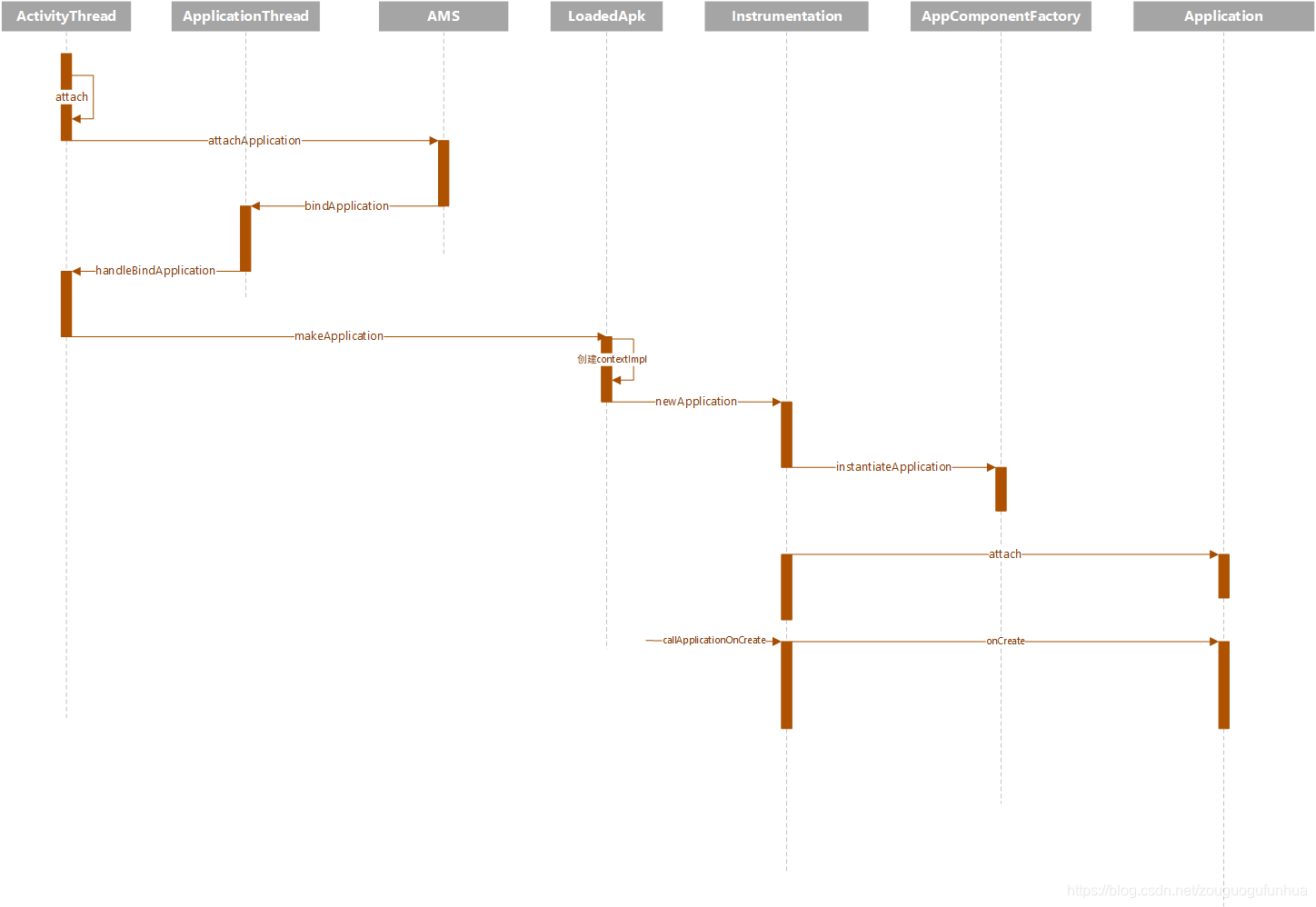 通过ActivityThread的Instrumentation对象的newApplication方法创建了Application对象。newApplication方法通过AppComponentFactory的instantiateApplication方法实例化Application对象,完成后返回。