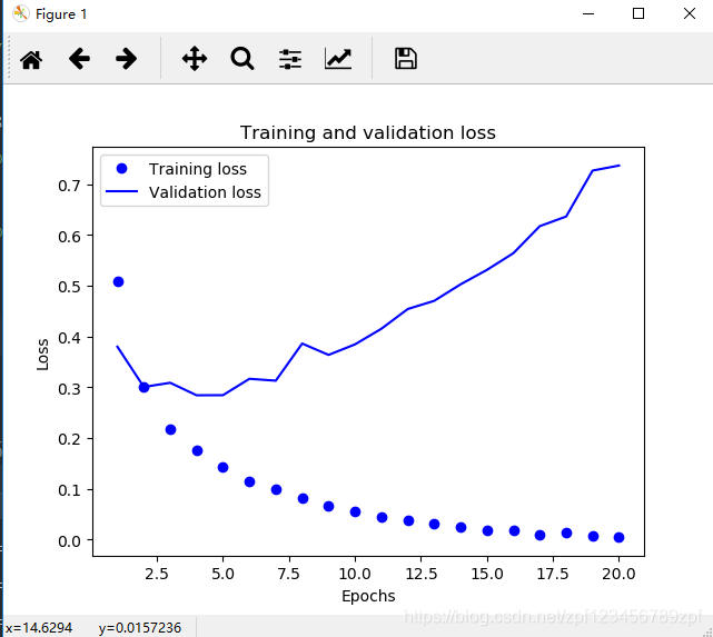 input = layers.Input(shape=(10000,)) hidden = layers.Dense(16, activation='relu')(input) hidden2 = layers.Dense(16, activation='relu')(hidden) output = layers.Dense(1, activation='sigmoid')(hidden2) model = Model(input=input, output=output) model.compile(optimizer='rmsprop',\ loss='binary_crossentropy', metrics=['accuracy']) x_val = train_data_vec[:10000] y_val = train_labels[:10000] pre_train_data = train_data_vec[10000:] pre_train_labels = train_labels[10000:] history = model.fit(pre_train_data, pre_train_labels,\ epochs=20, batch_size=512,\ validation_data=(x_val, y_val)) history_dict = history.history loss_values = history_dict['loss'] val_loss_values = history_dict['val_loss'] epochs = range(1, len(loss_values) + 1) plt.plot(epochs, loss_values, 'bo', label='Training loss') plt.plot(epochs, val_loss_values, 'b', label='Validation loss') plt.show() # model = load_model('my_model.h5') result = model.evaluate(test_data_vec, test_labels) print(result) model.save('my_model.h5')