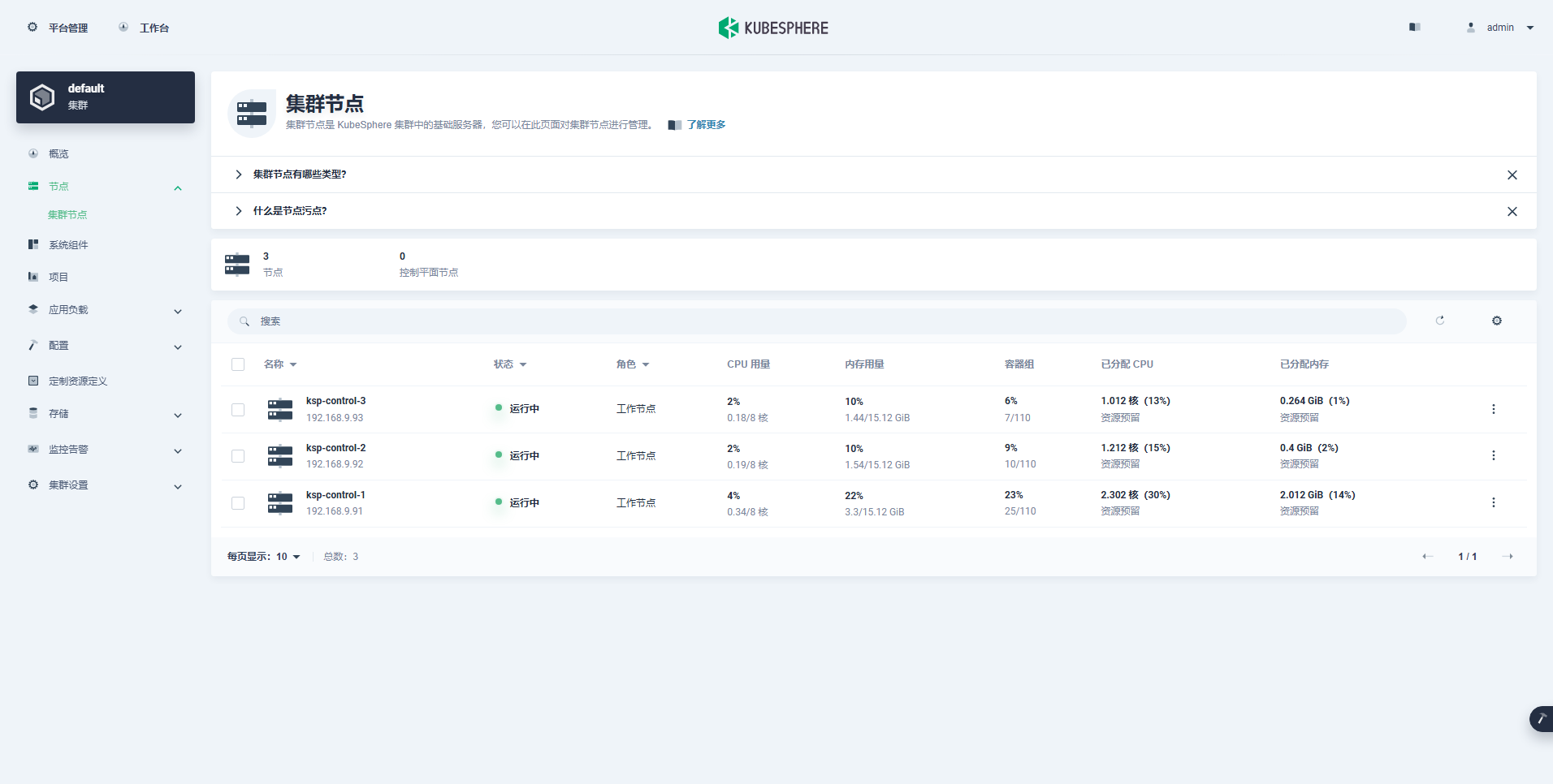 | ksp-control-3 | 192.168.9.93 | 8 | 16 | 40 | 100 | KubeSphere/k8s-control-plane/Worker |