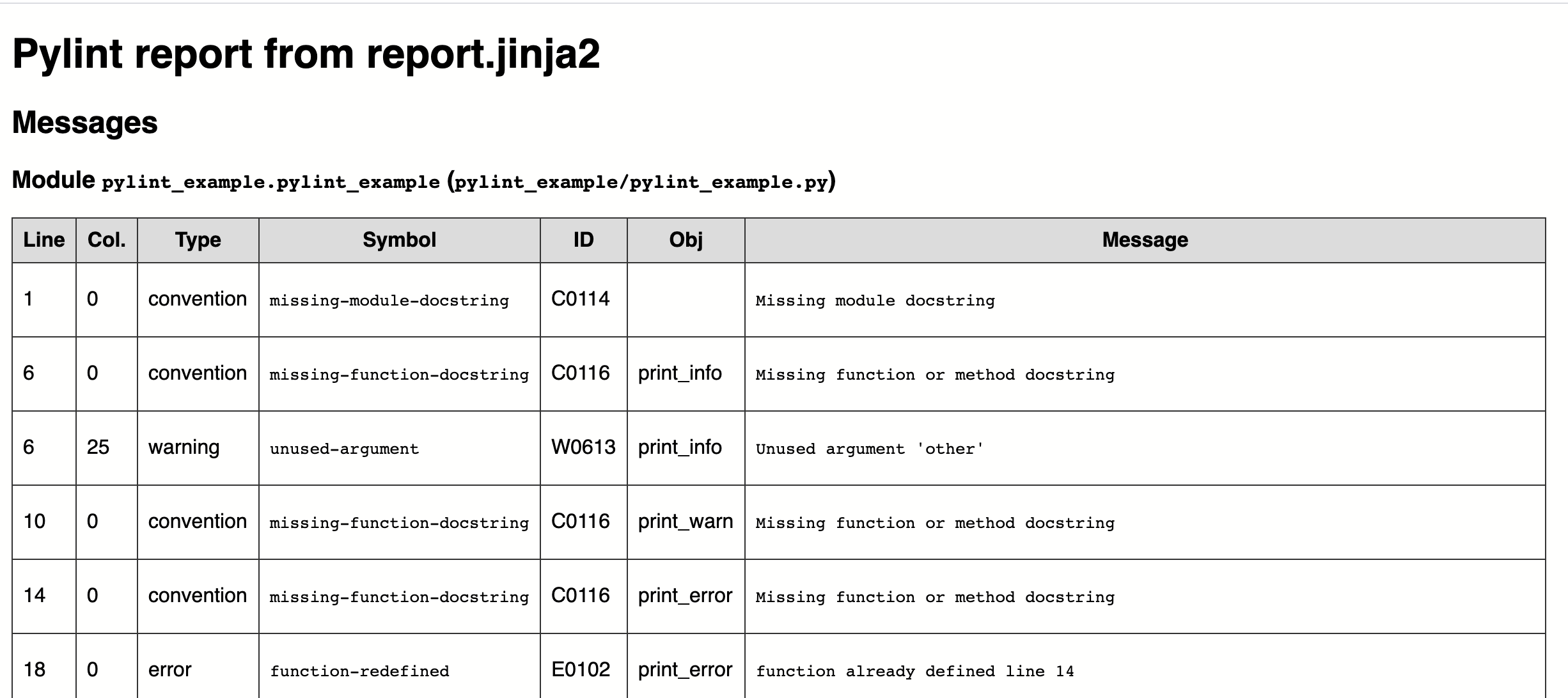 pylint pylint_example/ -f json | pylint-json2html -o pylint.html