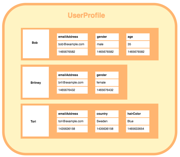 - 每一行可以包含与其他行不同数量的列。而且这些列不必与其他行的列匹配(例如,它们可以有不同的列名、数据类型、数量等)。