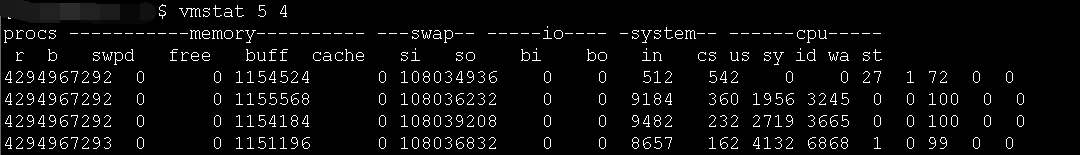vmstat 5 4 每5秒打印1次内存、IO 使用情况,一共打印4次