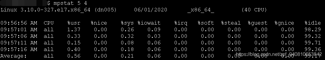 mpstat 5 4 每5秒打印1次 CPU 使用情况,一共打印4次